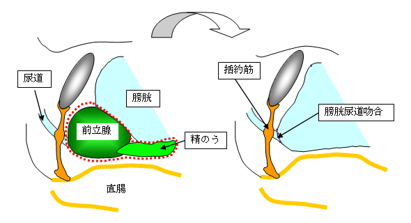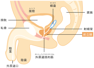 前立腺は男性だけにある臓器で、膀胱のすぐ下、骨盤の最も深いところに位置しています。前立腺のはたらきは、男性の生殖機能に密接に関係しています。尿の通り道である尿道と、精液の通り道である射精管は、前立腺の中で合流します。