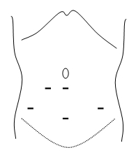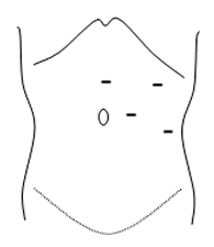 (1) 下腹部に図のように小切開を加え、トロッカーと呼ばれる筒状の管を入れます。トロッカーのひとつから炭酸ガスを注入して、下腹部を膨らまして内視鏡の視野を良くします。