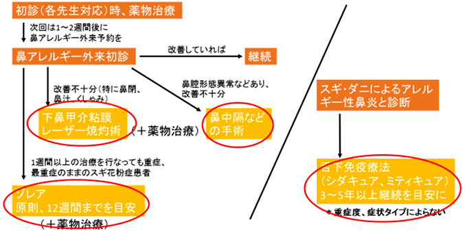 当科ではアレルギー性鼻炎の原因となっている抗原の特定のために血液検査を行ない、それと並行して鼻アレルギー診療ガイドラインに則った標準的な薬物治療(内服や点鼻薬など)を行なっております。それでも改善が乏しい患者様に対しては③手術(レーザー治療や鼻中隔手術など)や、④免疫療法(舌下免疫療法:スギ、ダニに対する治療)も行なっています。