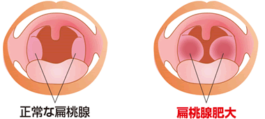 鼻の奥にあるアデノイドとよばれる組織や、いわゆる「扁桃腺」の肥大により、上気道が狭窄するため、いびきの原因になることがあります。