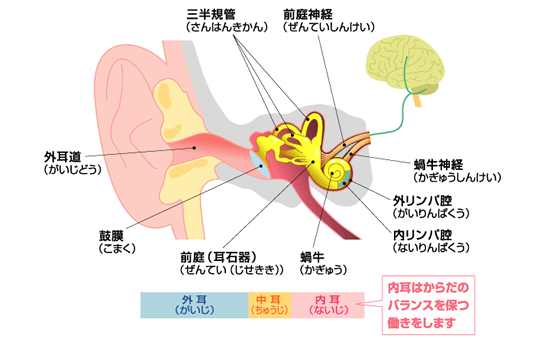 ぐるぐる回る、ふらつく、ふわふわする、まっすぐ歩けない、頭が重い…、「めまい」と表現される症状にもいろいろあります。激しい頭痛を伴ったり、持病のある方の急なめまいであったりすれば頭蓋内疾患(脳出血、脳梗塞等)や心疾患(血圧変動、血糖値変動)などがあります。しかし、実際には耳が原因で起こるめまいも多いことは意外に知られていません。