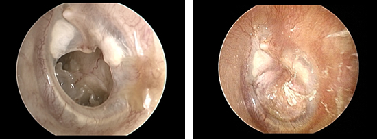 鼓膜穿孔(左図)と鼓膜形成術後(右図)の内視鏡写真