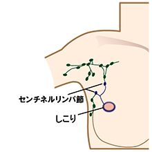 術前の画像診断で腋窩リンパ節に転移のなさそうな方には、手術中に数個のリンパ節を生検し、その場で病理診断を行い、生検したリンパ節に転移がなければ腋窩郭清は行わないようにしています(センチネルリンパ節生検)。