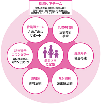 当センターでは、乳がんに対して最新の乳癌診療ガイドラインに沿った治療をご提供しています。スタッフは日本乳癌学会認定の乳腺専門医2名、がん化学療法看護認定看護師を中心とした看護師チーム、遺伝性乳がんについてのカウンセリングを担当する認定遺伝カウンセラーがチームを組んでいます。乳房再建や放射線治療、薬物療法の副作用管理・治療は、総合病院の強みを生かして各診療科の専門医と協力して行っています。
