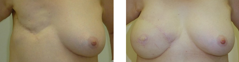 乳がんの手術で生じる乳房欠損や変形を可能な限り回復させる手術を”乳房再建”といいます。その方法には、乳房のふくらみを人工物で再建する方法(エキスパンダー・インプラント法)と、腹部、背部などの皮膚と脂肪を胸に移動、移植する方法(自家組織移植法)があります。また、これらの乳房再建を乳がん手術と同時に行う場合と乳がん手術を終えて一定期間空けてから乳房再建を行う方法があり、様々な組み合わせがあります。乳腺センターでは乳腺外科と形成外科が連携し、患者さんの状態、希望に合わせて、再建方法、時期を検討、選択しています。
