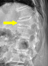 骨粗鬆症性椎体骨折のX線。矢印の部位の椎体がつぶれています。