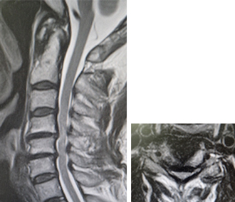 頚椎症性脊髄症のMRI。脊髄が高度に圧迫されています。