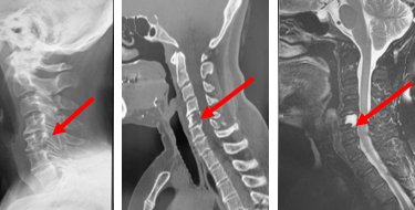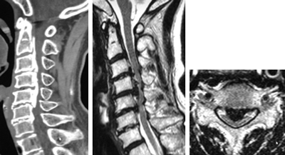 頚椎後縦靱帯骨化症のCT、MRI。骨化によって脊髄が高度に圧迫されています。