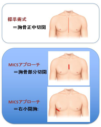 近年では、胸骨正中切開をしないいわゆる低侵襲手術が行われるようになっています。これは英語の頭文字をとってMICS(ミックス)とも呼ばれています。胸骨を部分的に切開する方法や、右側の肋骨の間を開胸して行う方法があります。