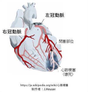 一方、冠動脈閉塞により血流が途絶し壊死(えし)となった状態を心筋梗塞といいます。冠動脈の上流が急に閉塞した場合、急性心筋梗塞となり突然死のリスクがあります。