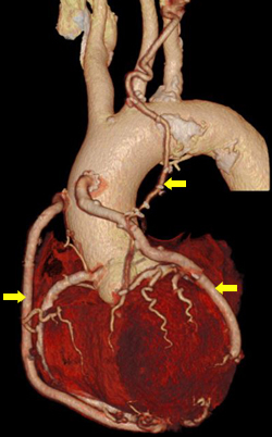 心臓カテーテル検査にて、左冠動脈の付け根の狭窄を含む多数の病変を認めました。