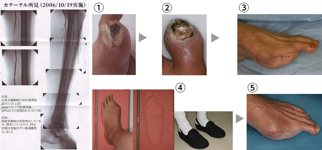 ①循環器内科医から届いた紹介状(カテーテル治療所見)と紹介時の傷。(左第1趾先端部の壊疽)