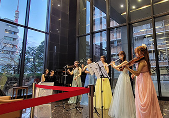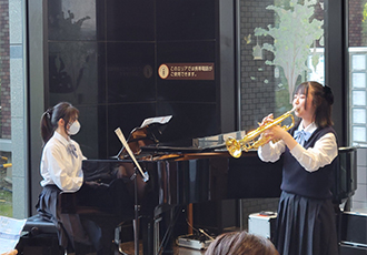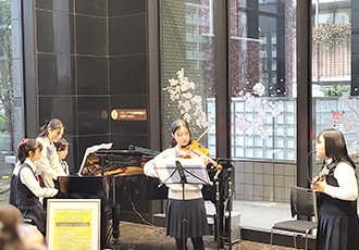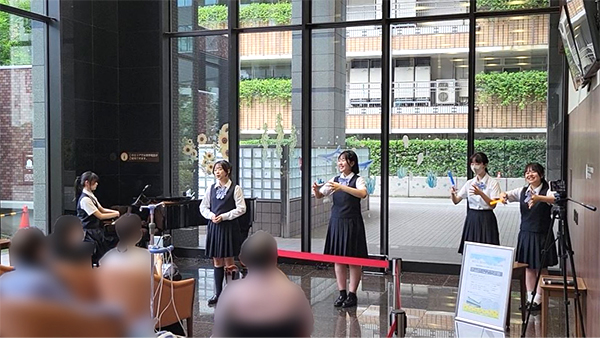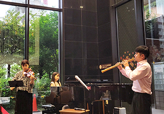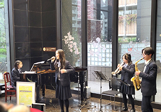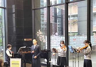 6月12日、東京音楽大学附属高校のみなさんによるロビーコンサートを開催しました。昨年から3回目となる同校のコンサートですが、今回は、サックスやトランペットなど新たな楽器も加わり、午後のゆったりとしたひとときにぴったりな映画音楽やジャスを演奏してくださいました。有名なモーツアルトのバイオリン協奏曲では、1楽章を見事に弾ききり、会場からは大きな拍手がおこりました。