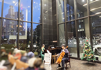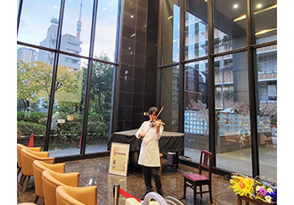有名なオペラのアリアからおなじみの歌謡曲まで、わかりやすく楽しい曲目解説とともに、ヴァイオリンとオーボエそれぞれの音色を活かしたアンサンブルを披露していただきました。コンサートが進むにつれ日が暮れていき、音楽と相まって会場がとてもいい雰囲気につつまれました。最後は東京タワーの夜景をみながら、一足早いクリスマスソングのアンコールで締めくくりました。