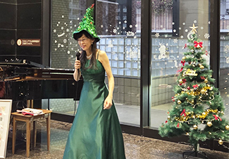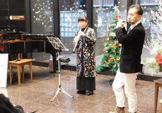 12月24日、職員によるクリスマスコンサートを開催しました。脳神経内科 岩田信恵副院長が司会を務め、岩田副院長のおしゃれなジャズ・ピアノ・ソロによる「White Christmas」でコンサートが始まりました。続いて、脳神経外科 石川医師の龍笛で、代表的な雅楽「越天楽」をクリスマスアレンジで演奏しました。そして、内科の富樫医師が、バッハの「主よ、人の望みの喜びよ」など、クリスマス定番の曲をピアノで披露しました。