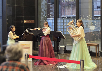 1月14日、Trio・Plum Quartz(トリオ・プラムクォーツ)によるロビーコンサートを開催しました。フルート、ユーフォニアム、ピアノというめずらしい編成のトリオで、お正月気分を感じられる楽しいプログラムを披露してくださいました。