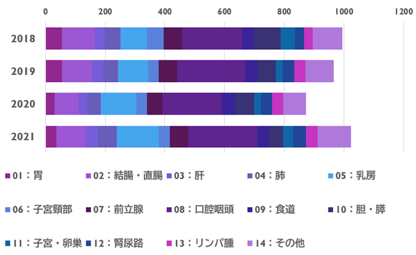 - 2020年はコロナ感染症の流行が始まった年であり、前2年間に比べていずれの部位も登録数が減少しています。