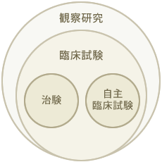 臨床研究は、臨床試験(治験、自主臨床試験)や観察研究からなります。